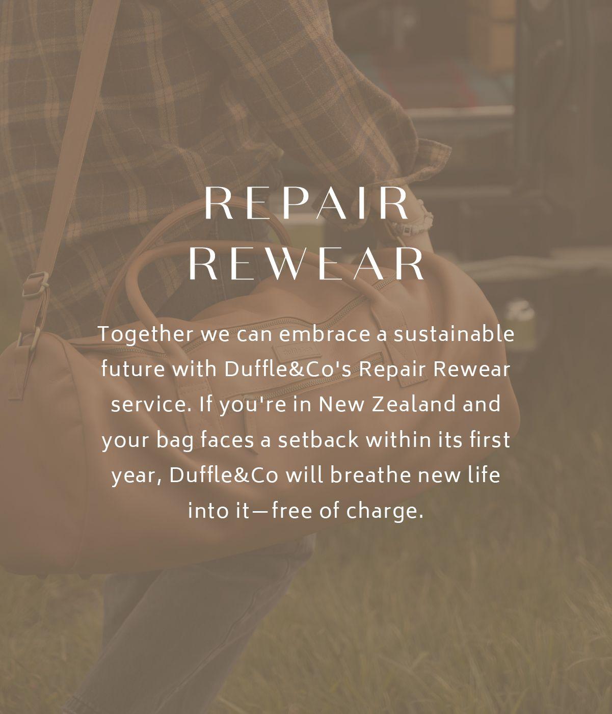 If you're in New Zealand, your order was placed within the last 12 months and your bag faces a setback within its first year, Duffle&Co will breathe new life into it—free of charge. For orders outside the 12-month window or outside New Zealand, repair is still available at your own cost. Together we can embrace a sustainable future with Duffle&Co's Repair Rewear service.